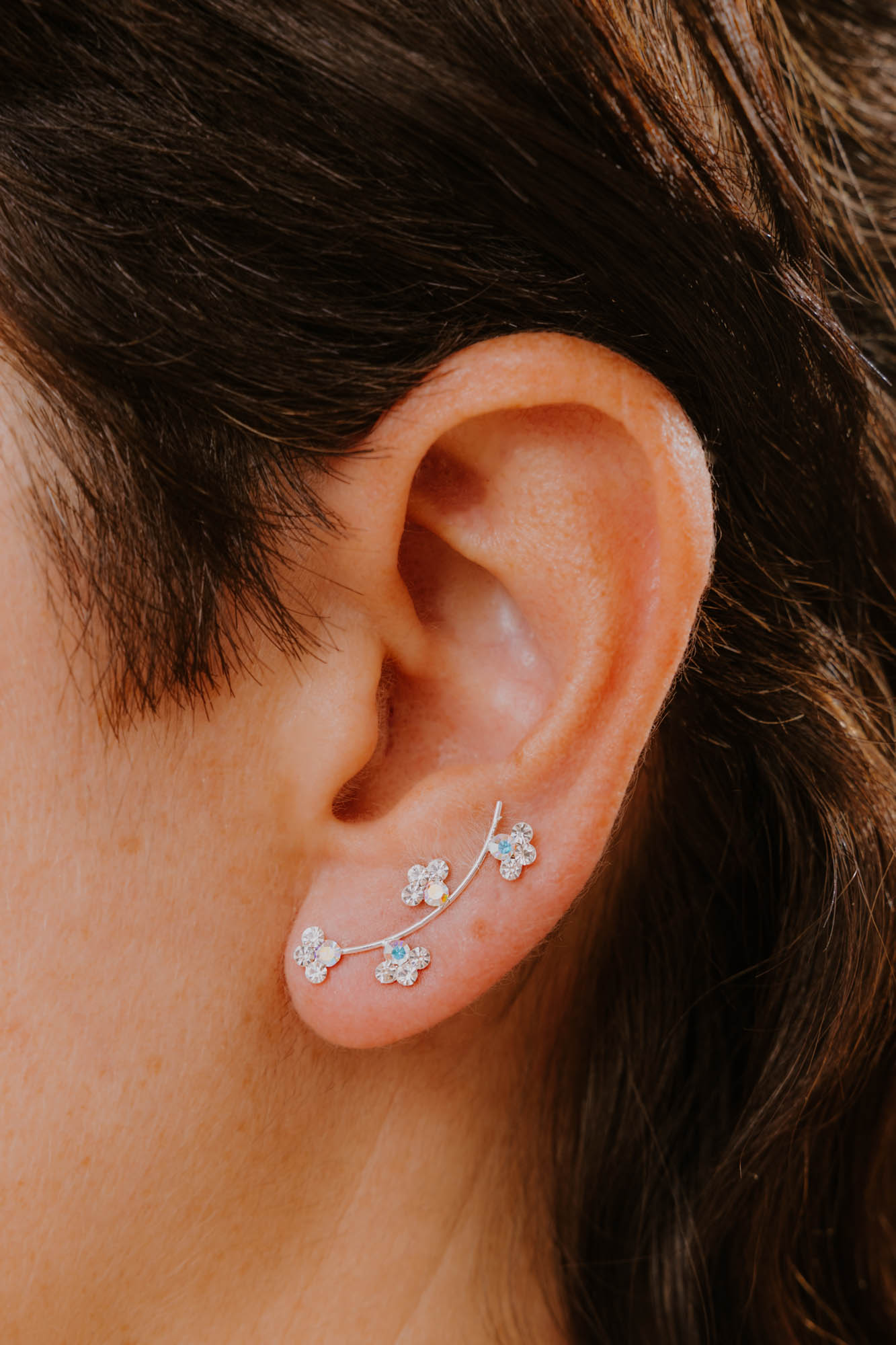 Un diseño lleno de luz, equilibrio y feminidad. Este pendiente trepador de plata de ley 925 combina la delicadeza de pequeñas flores intercaladas con el brillo especial de circonitas cuidadosamente engastadas, creando una joya armoniosa que se desliza a lo largo del lóbulo como una línea de belleza natural y sofisticada. Pequeñas flores estilizadas con circonitas se alternan con espacios suaves, evocando un jardín minimalista que sube de forma orgánica por la oreja aportando destellos sutiles pero cautivadores, capturando la luz en cada movimiento con un resplandor que no pasa desapercibido. La combinación de texturas y brillos crea un juego visual mágico, sin perder la esencia de un diseño limpio y elegante. Gracias a su forma tipo ear climber, este pendiente sigue la línea natural del lóbulo hacia el cartílago, ofreciendo un ajuste cómodo y seguro sin necesidad de perforaciones adicionales. Perfecto para quienes buscan una joya versátil que destaque tanto en looks diarios como en ocasiones especiales. Combina a la perfección con nuestros pendientes minis brillis o lisos, ear curffs y aros. Un pequeño universo de flores y luz que se lleva con naturalidad y estilo. Características: