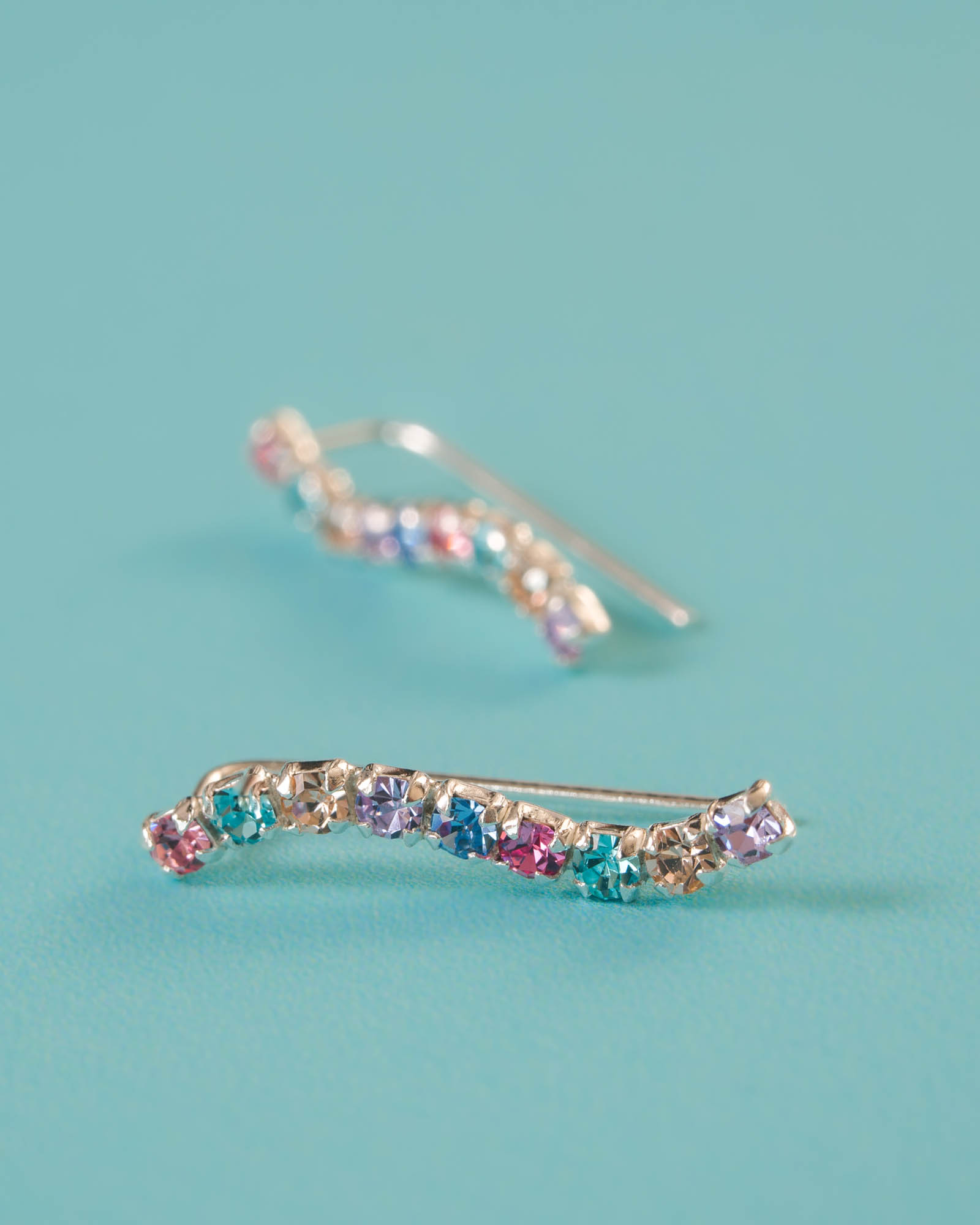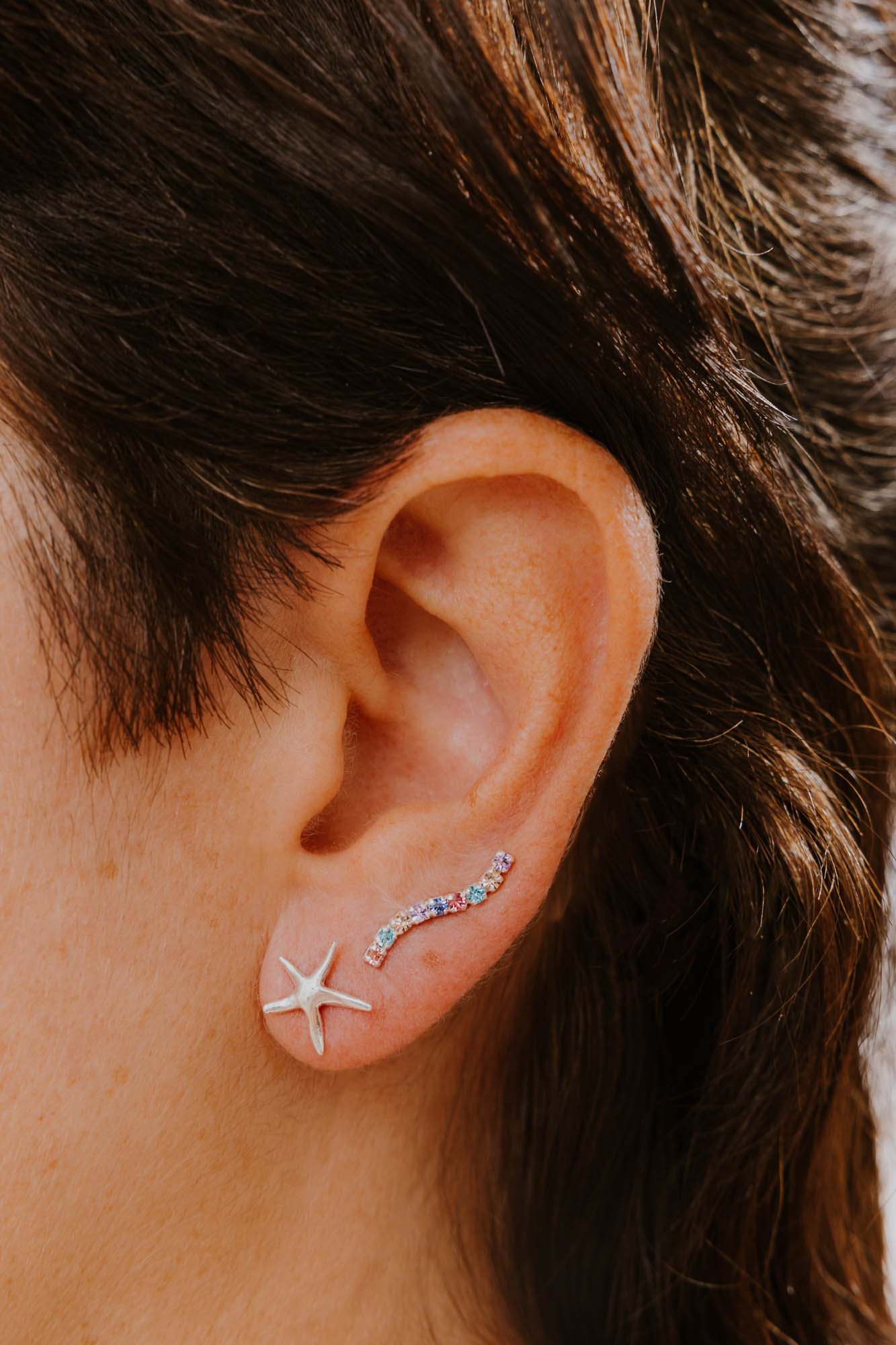 Pendiente trepador de plata de ley 925 con circonitas engastadas en tonos pastel. Su delicado diseño en forma de «S» alargada, que evoca la silueta de un infinito moderno, se adhiere suavemente al lóbulo para crear un efecto visual llamativo y elegante.