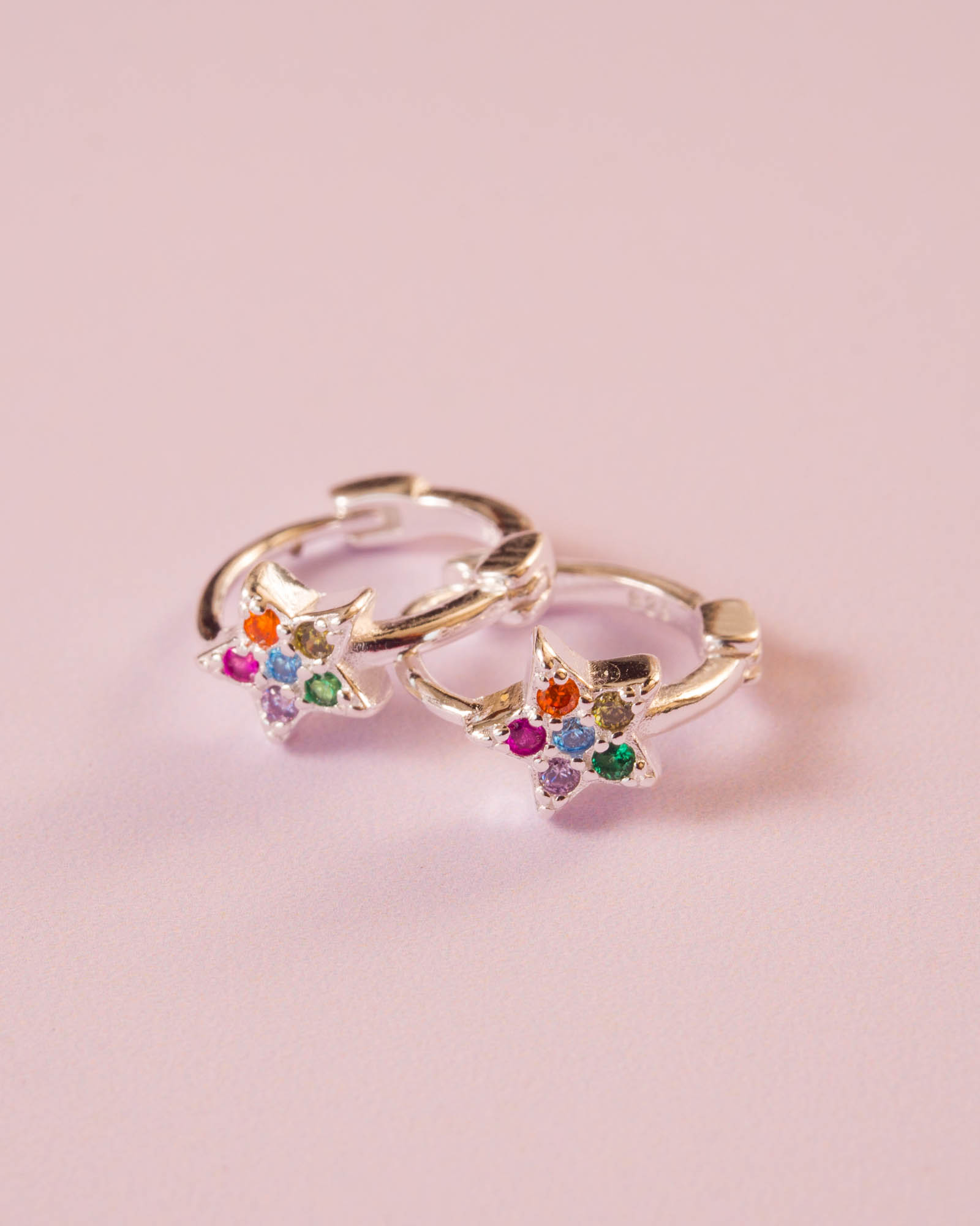 Un aro delicado y versátil en plata de ley 925, con una estrellita central decorada con circonitas de colores. Ligero, cómodo y perfecto para darle un toque de brillo a cualquier agujerito.