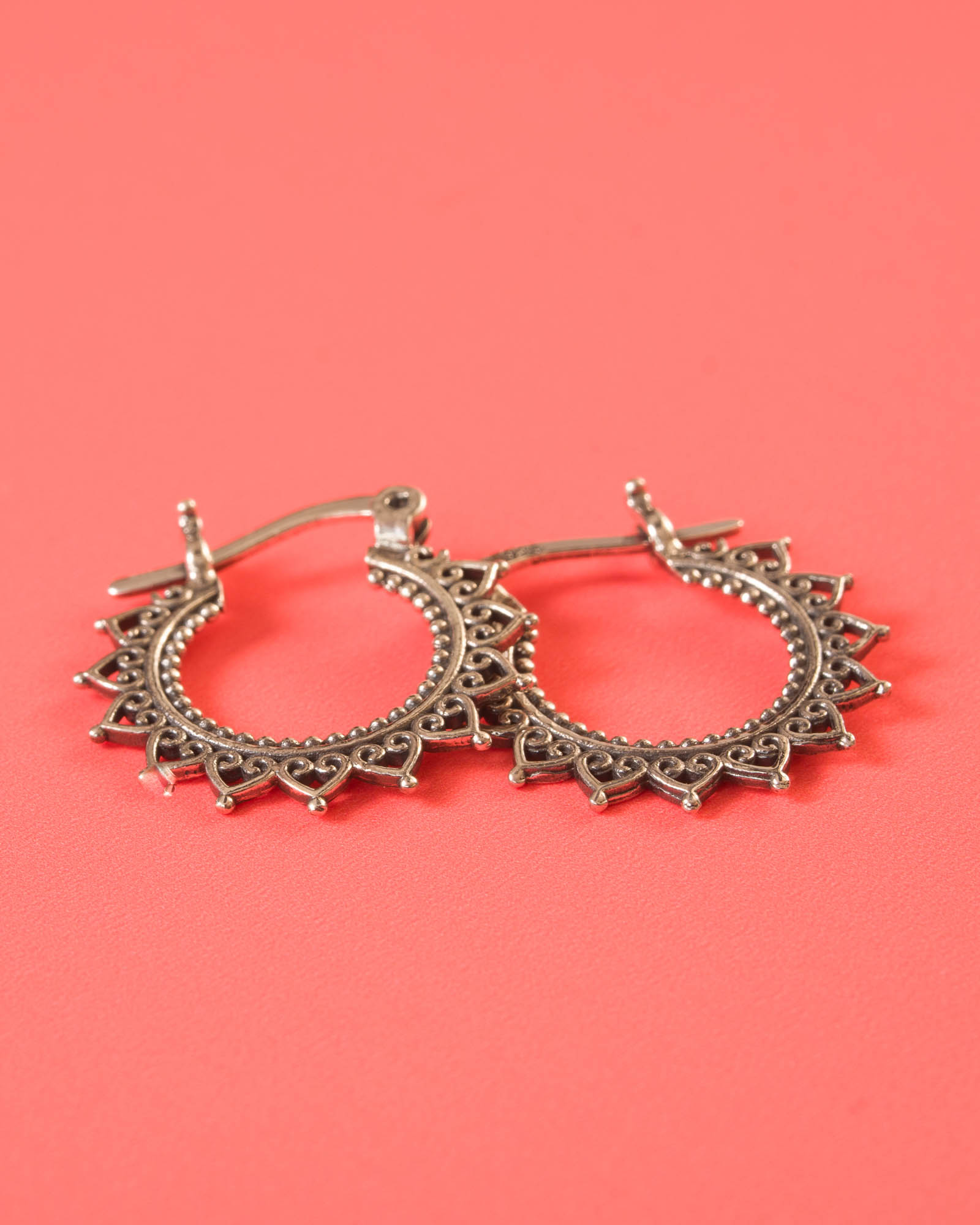 Aro en plata de ley (20 mm) con puntas delicadas y detalles ennegrecidos.