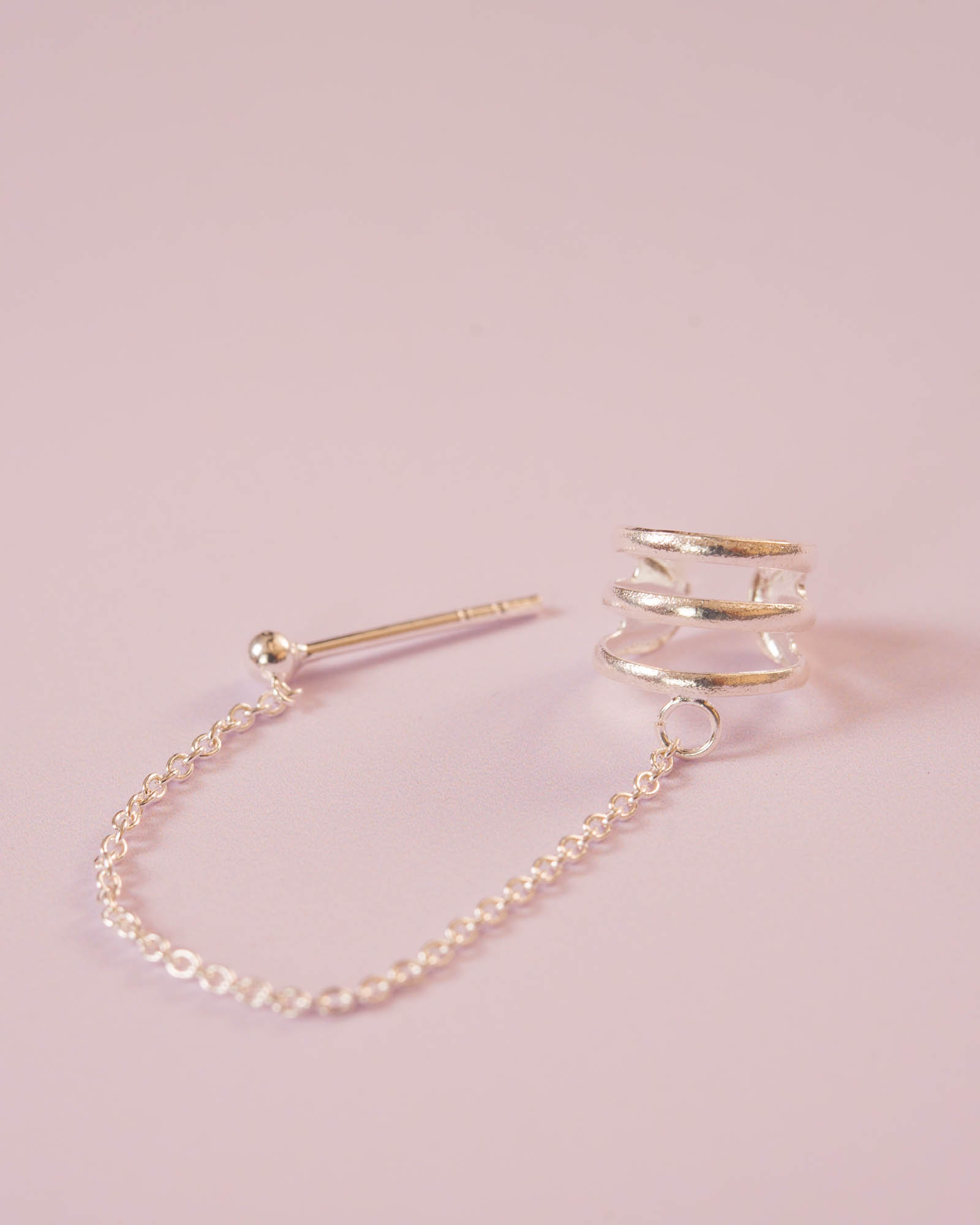 Ear Cuff con Cadena y Bolita en Plata 925 Un diseño que combina minimalismo, elegancia y originalidad. Este ear cuff está formado por tres líneas de plata de ley en la parte principal, dejando espacios abiertos entre cada línea para crear un efecto ligero, estiloso y moderno. Se ajusta a presión, por lo que no necesitas agujeros en esa sección, aportando comodidad sin sacrificar estilo. La cadena delicada conecta con un pequeño pendiente en forma de bolita que sí requiere un agujero e incluye su tuerca para un ajuste seguro. Gracias a esta combinación, visualmente da la sensación de llevar dos pendientes aunque solo necesites un agujero, creando un efecto llamativo y original sin complicaciones. Es perfecto para quienes buscan joyitas minimalistas pero con personalidad, ideales para el día a día o para destacar con un toque discreto pero diferente. Una pieza versátil, elegante y moderna que aporta un toque de estilo a cualquier look.