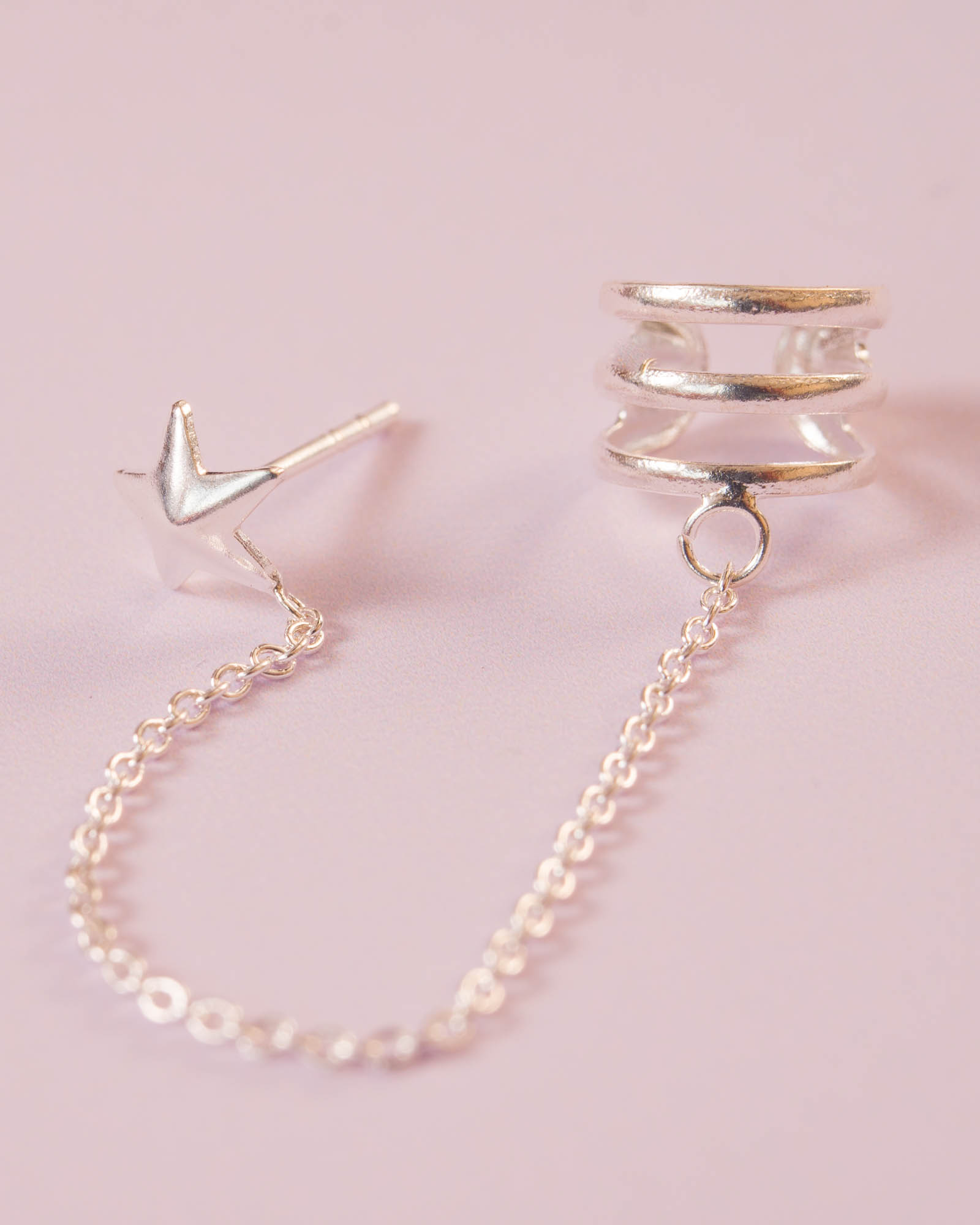 Ear Cuff con Cadena y Estrella en Plata 925 Un diseño original y lleno de estilo. Este ear cuff combina tres hilos de plata de ley con huecos abiertos entre cada línea, creando un efecto ligero y moderno que se ajusta a presión, sin necesidad de agujeros. La cadena conecta con un pendiente en forma de estrella que sí requiere un agujero e incluye su tuerca para un ajuste seguro. Gracias a esta combinación, visualmente parece que llevas dos pendientes aunque solo necesites uno, añadiendo un toque divertido y casual a tu look. Perfecto para quienes buscan joyitas vistosas, diferentes y con personalidad.