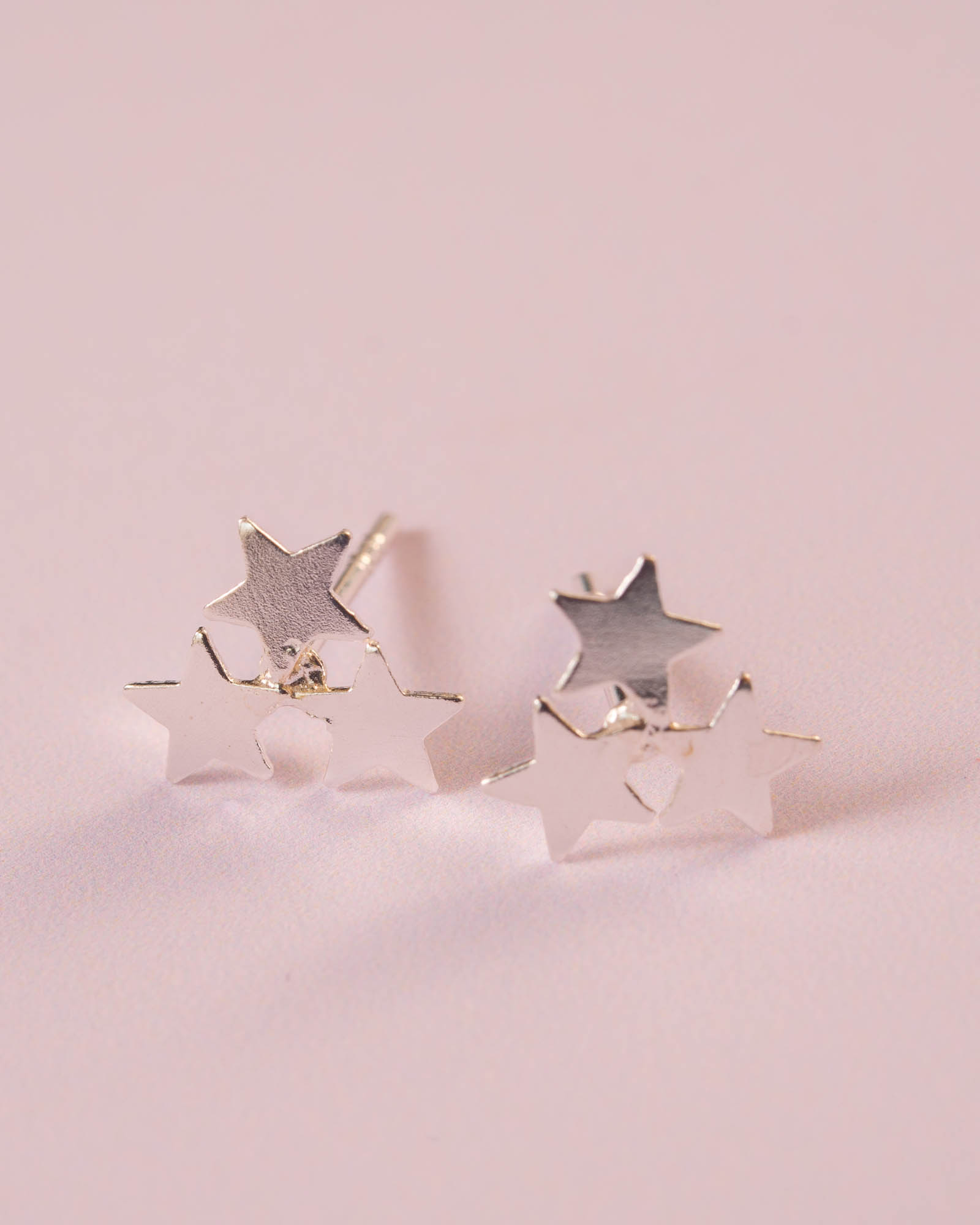 Pendiente en plata de ley mini con tres estrellas unidas en el centro. Ligero, hipoalergénico y atemporal. Perfecto para combinar con otros pendientes o para llevar solo. Perfecto para llevara a diario.