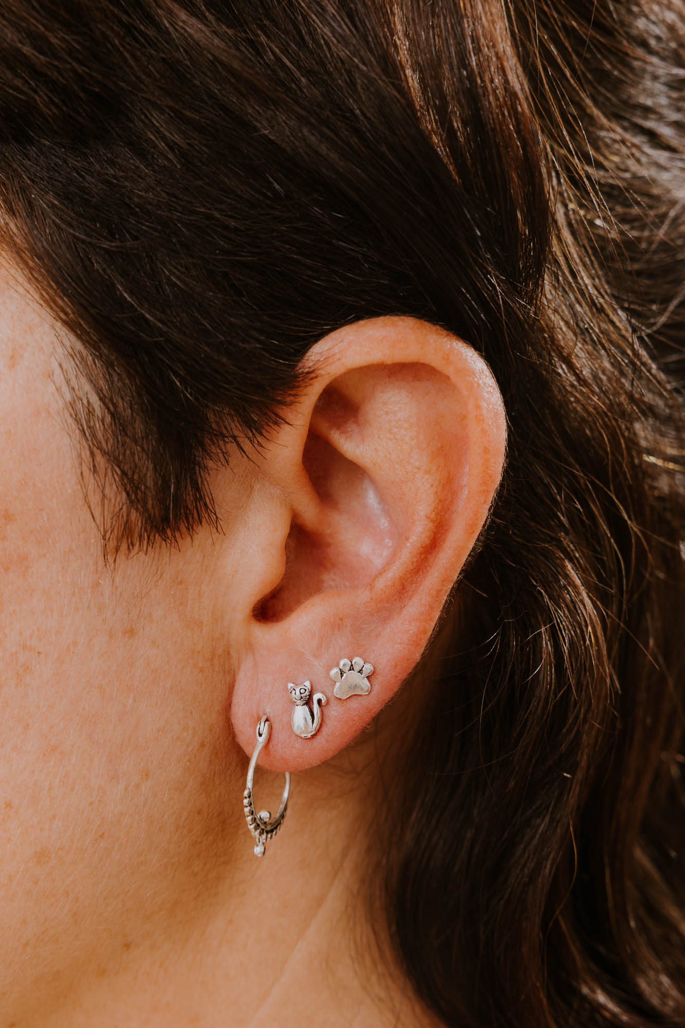 Pendiente mini en plata de ley con forma de gatito y con su linda colita hacia arriba. Es ideal para amantes de los gatitos y es perfecto para segundos, terceros, cuartos agujeros. Diseño minimalista, hipoalergénico y comodísimo para tu día a día. Un básico monísimo para tu colección.