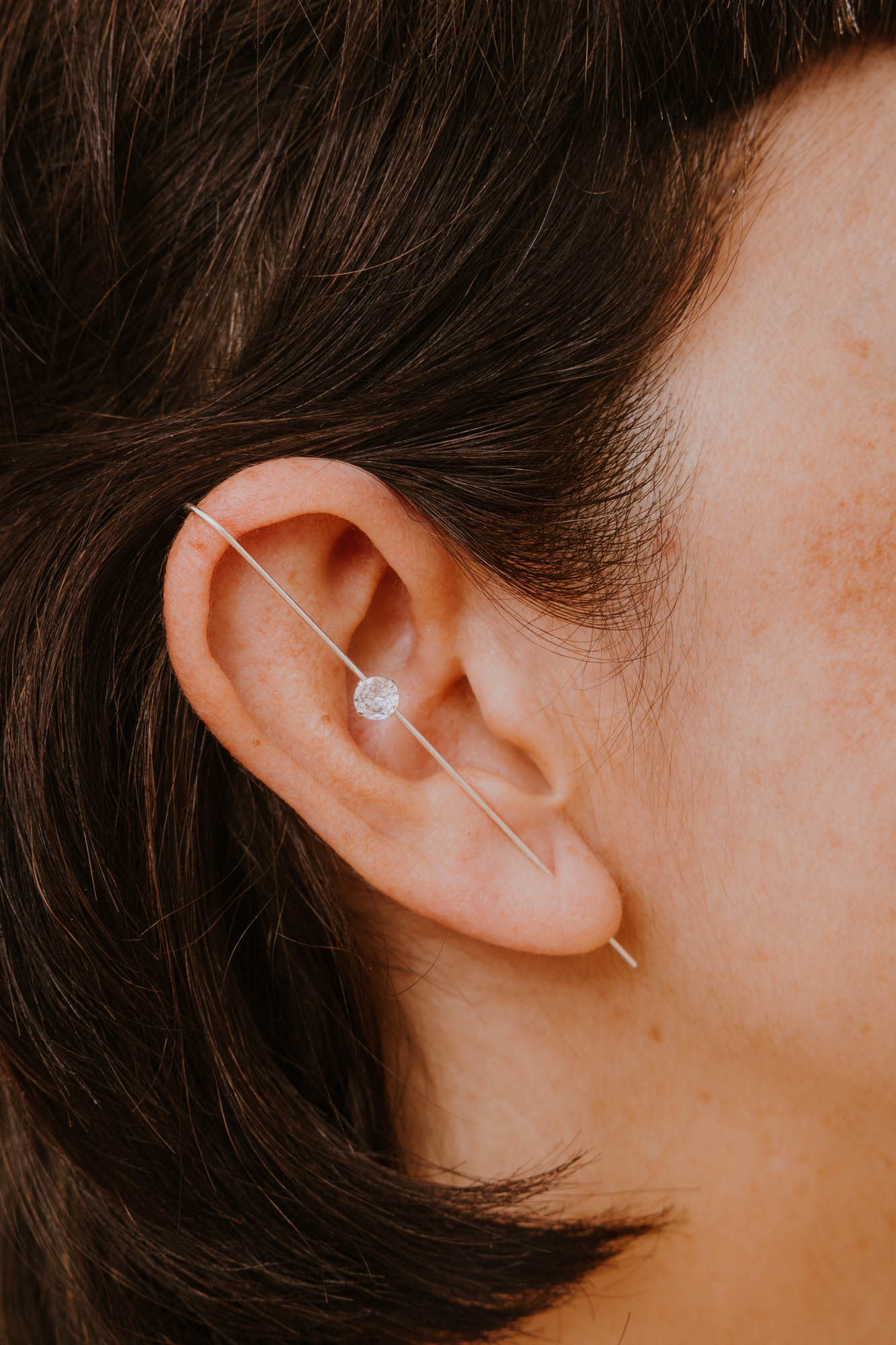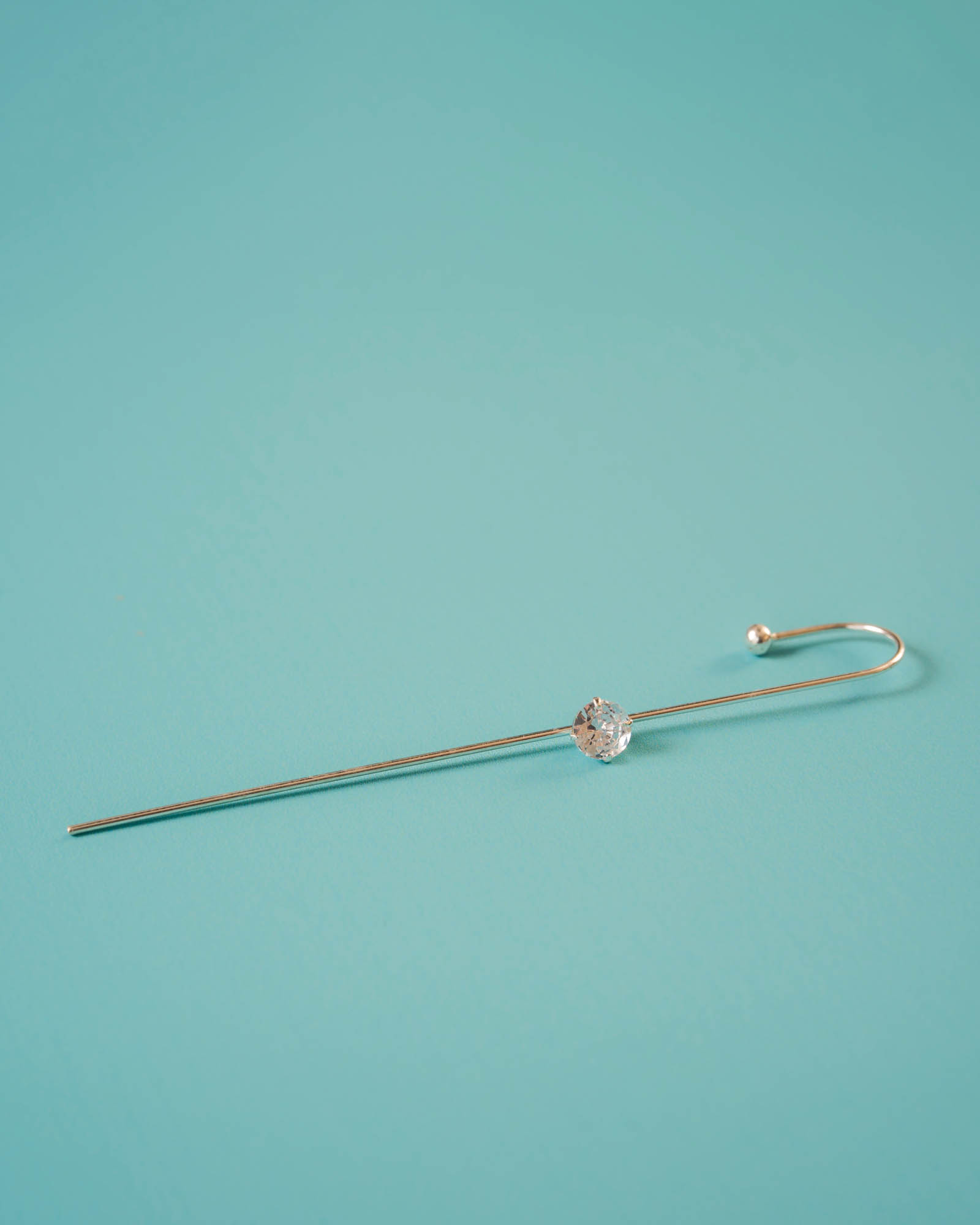 Pendiente en plata de ley 925 unitario en forma de palo con una circonita blanca en medio que le aporta un brillito muy especial. Este pendiente atraviesa la oreja con solo una perforación y se sujeta arriba por presión. Diseño atrevido, cómodo y diferente para un look moderno y divertido.