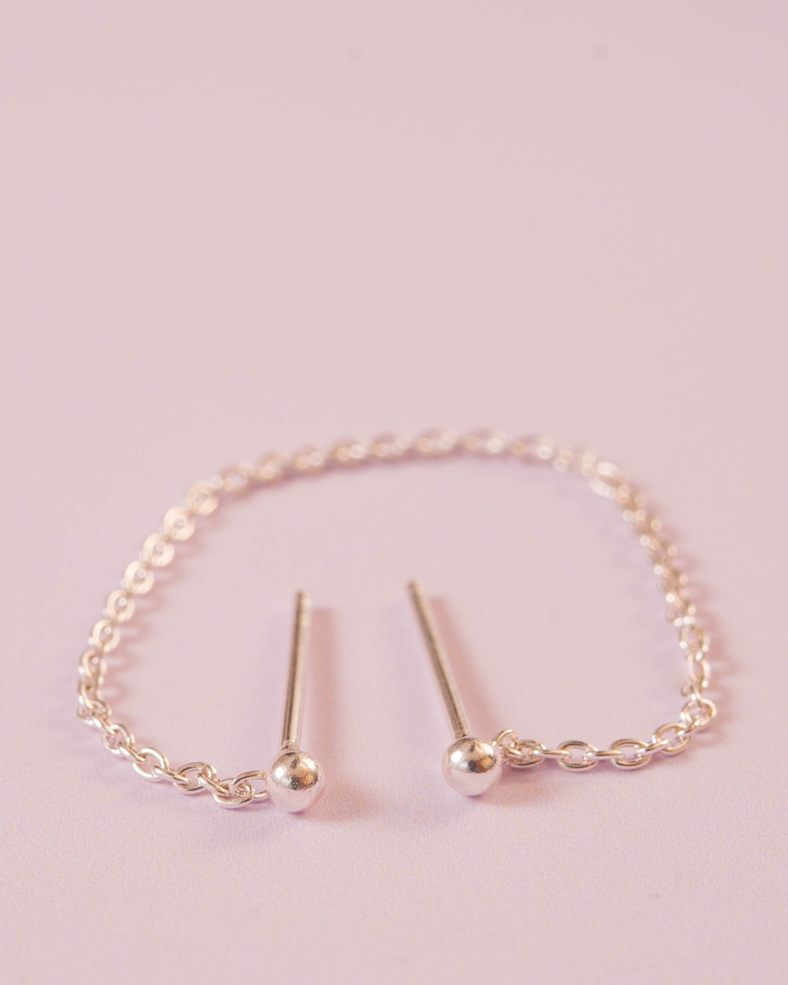 Dos studs de bolita unidos por una delicada cadenita, diseñado para dos perforaciones en la misma oreja. Incluye tuerquitas de seguridad.