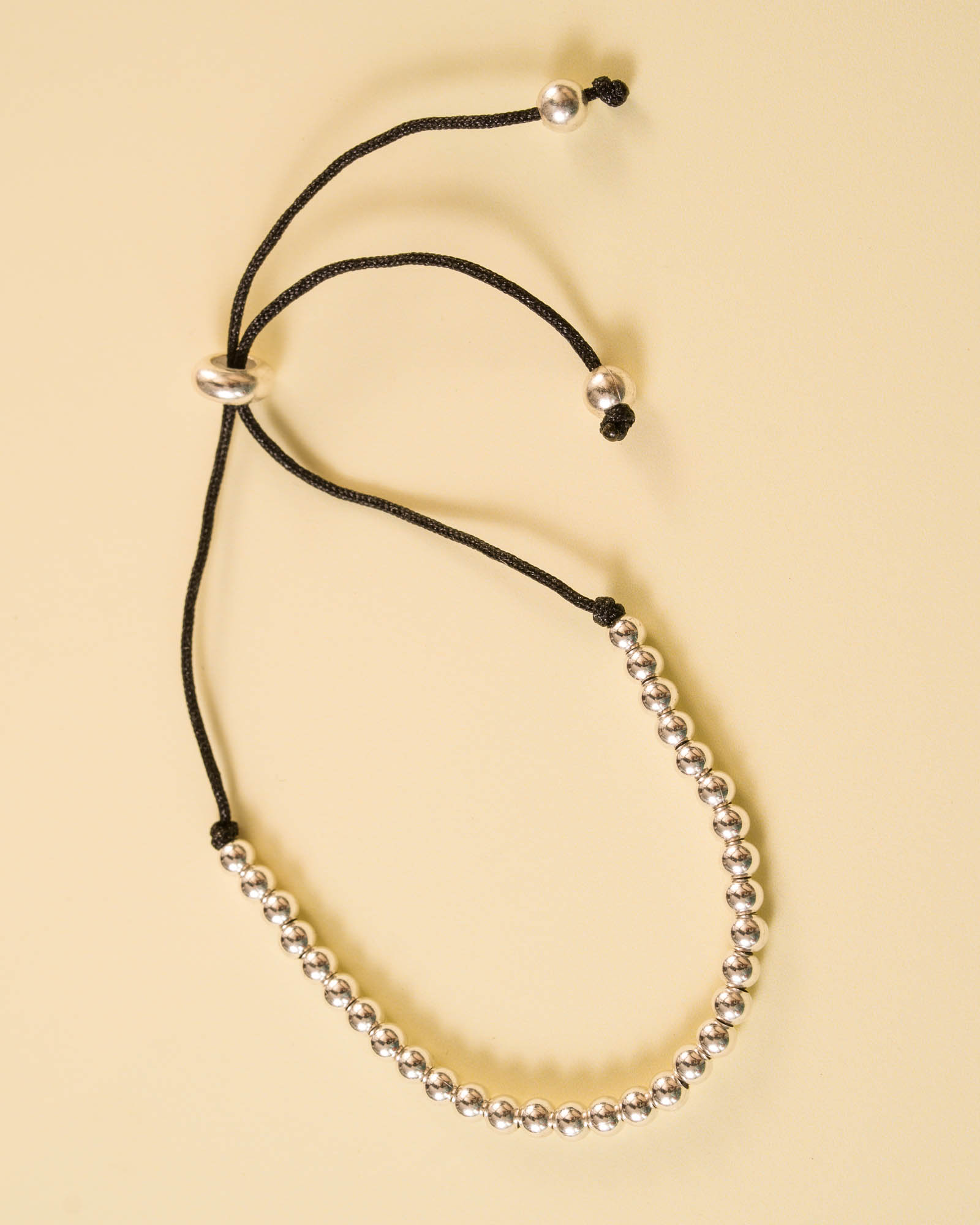 Pulsera de cordón con pequeñas bolitas en plata de ley. Ajustable gracias a su cierre deslizante, se adapta a muñecas pequeñas o grandes. Un detalle brillante y versátil, perfecto para combinar o llevar sola. Comodidad y estilo asegurado.