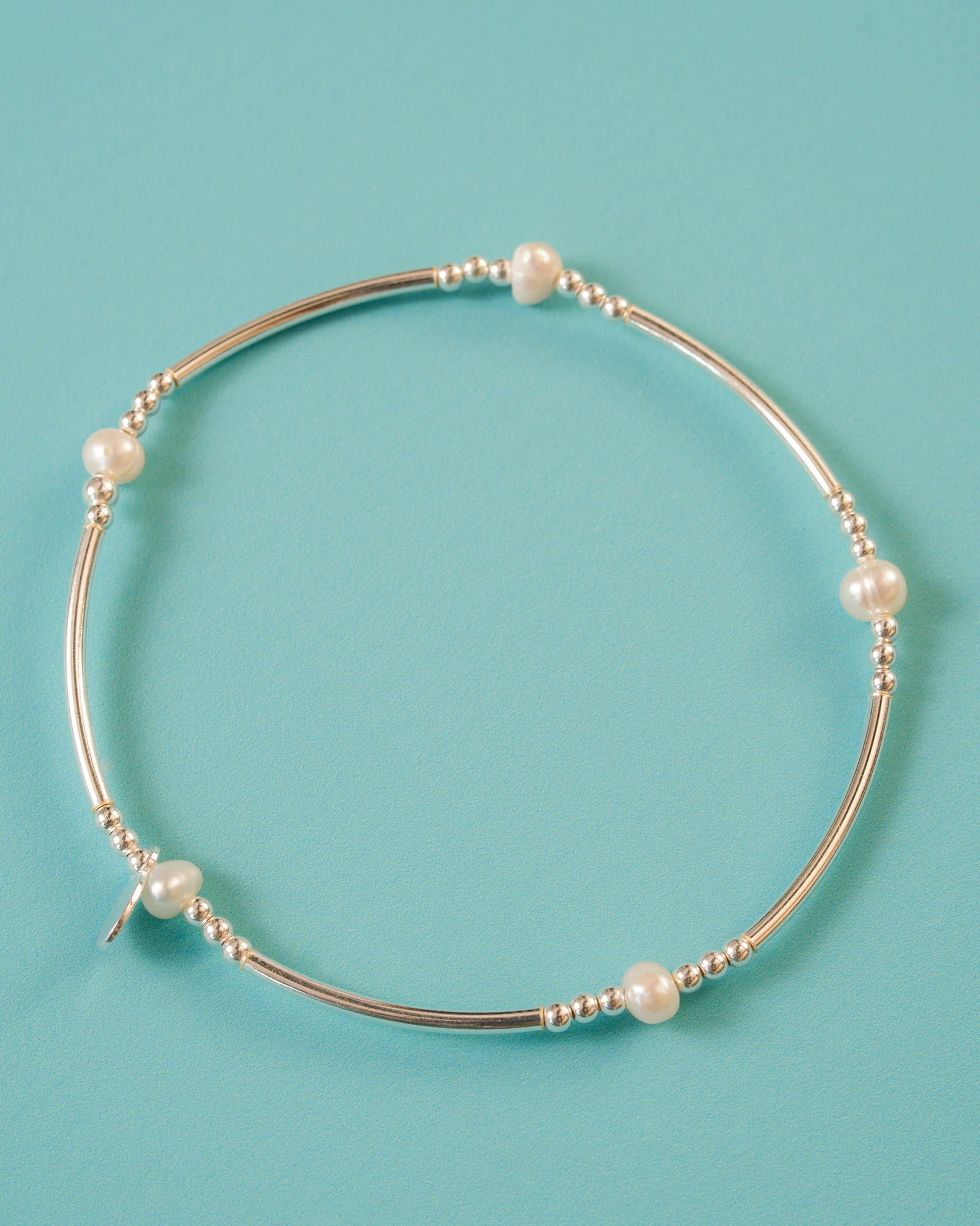 Una pulsera fina y delicada, compuesta por bolita de perla de río intercaladas con tres mini bolitas de plata a cada extremo y tubitos de plata de ley, creando un diseño sutil y elegante.