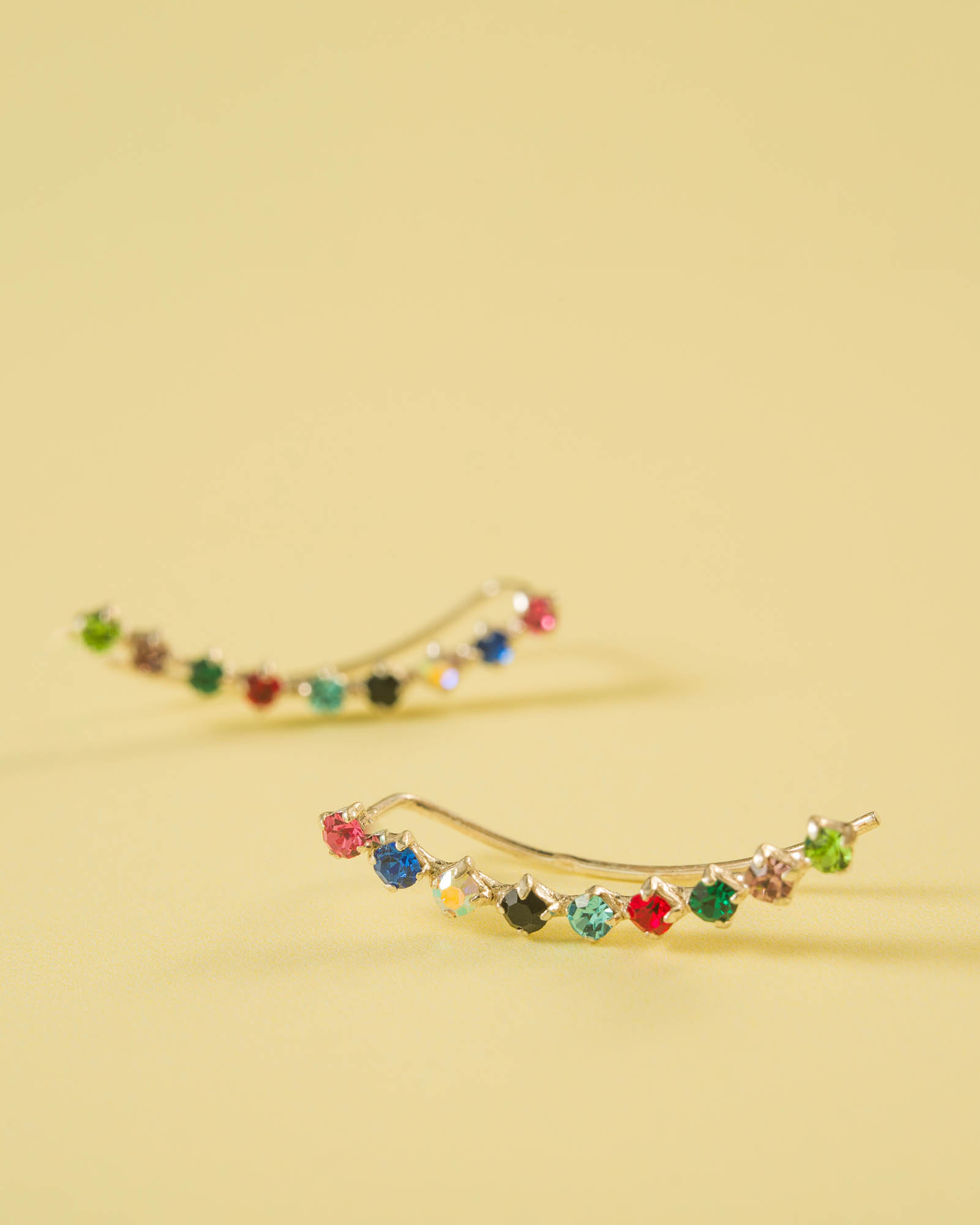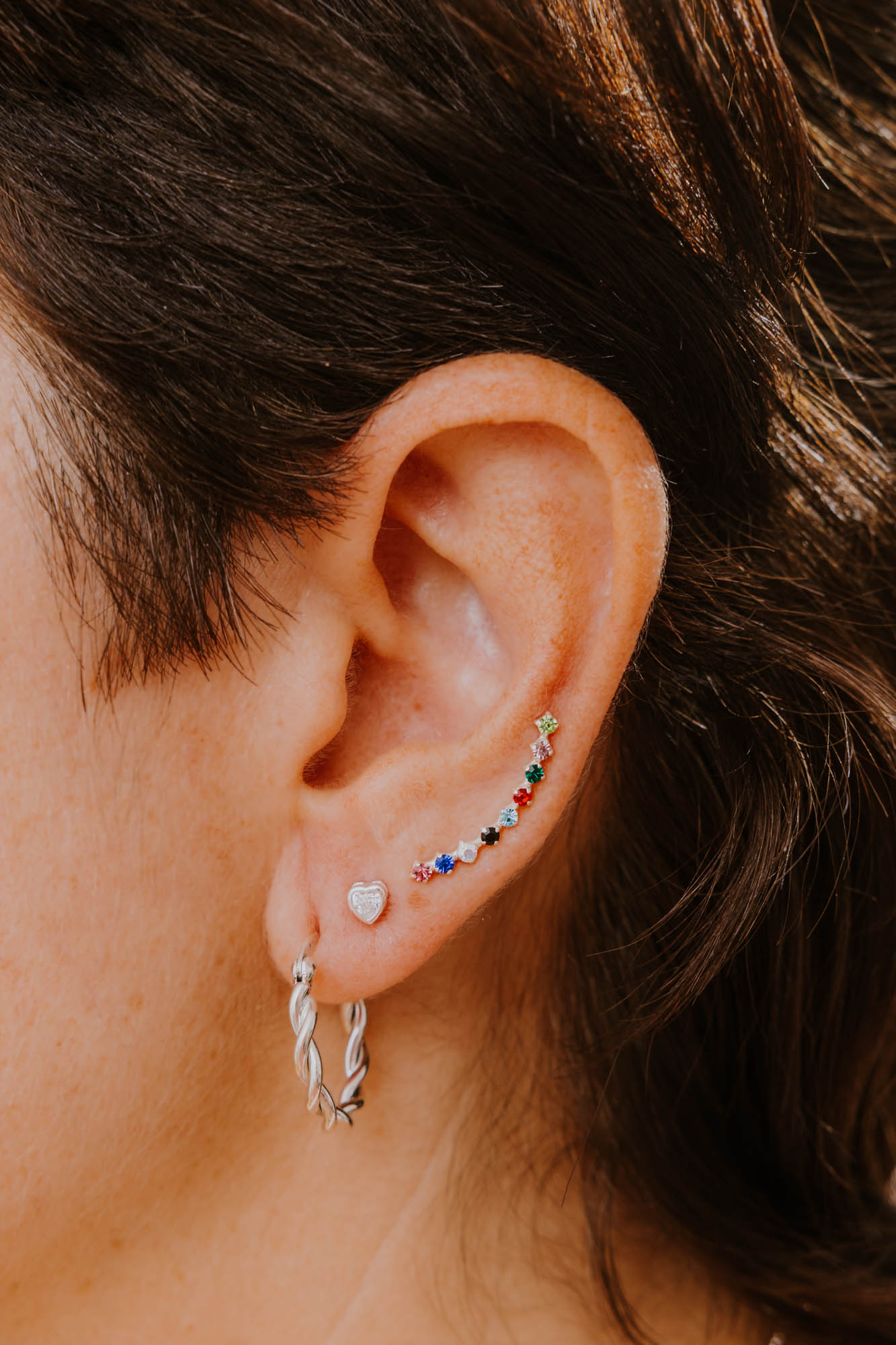 Este pendiente trepador de plata de ley 925 es la definición perfecta de sutileza con un toque vibrante. Su diseño fino y alargado con circonitas engastadas de colores se adapta al contorno del lóbulo, creando un efecto visual estilizado y moderno que realza cualquier look al instante. Perfecto para segundos, terceros, cuartos… agujeros