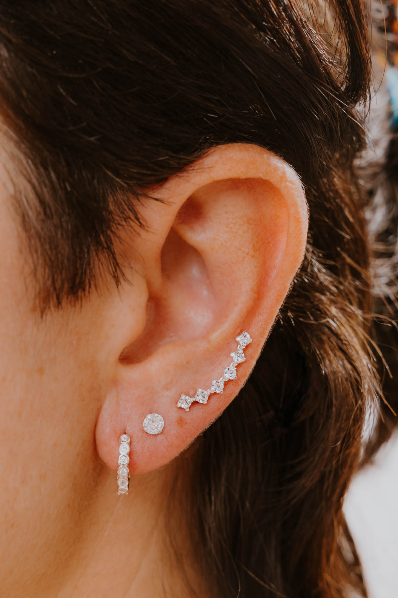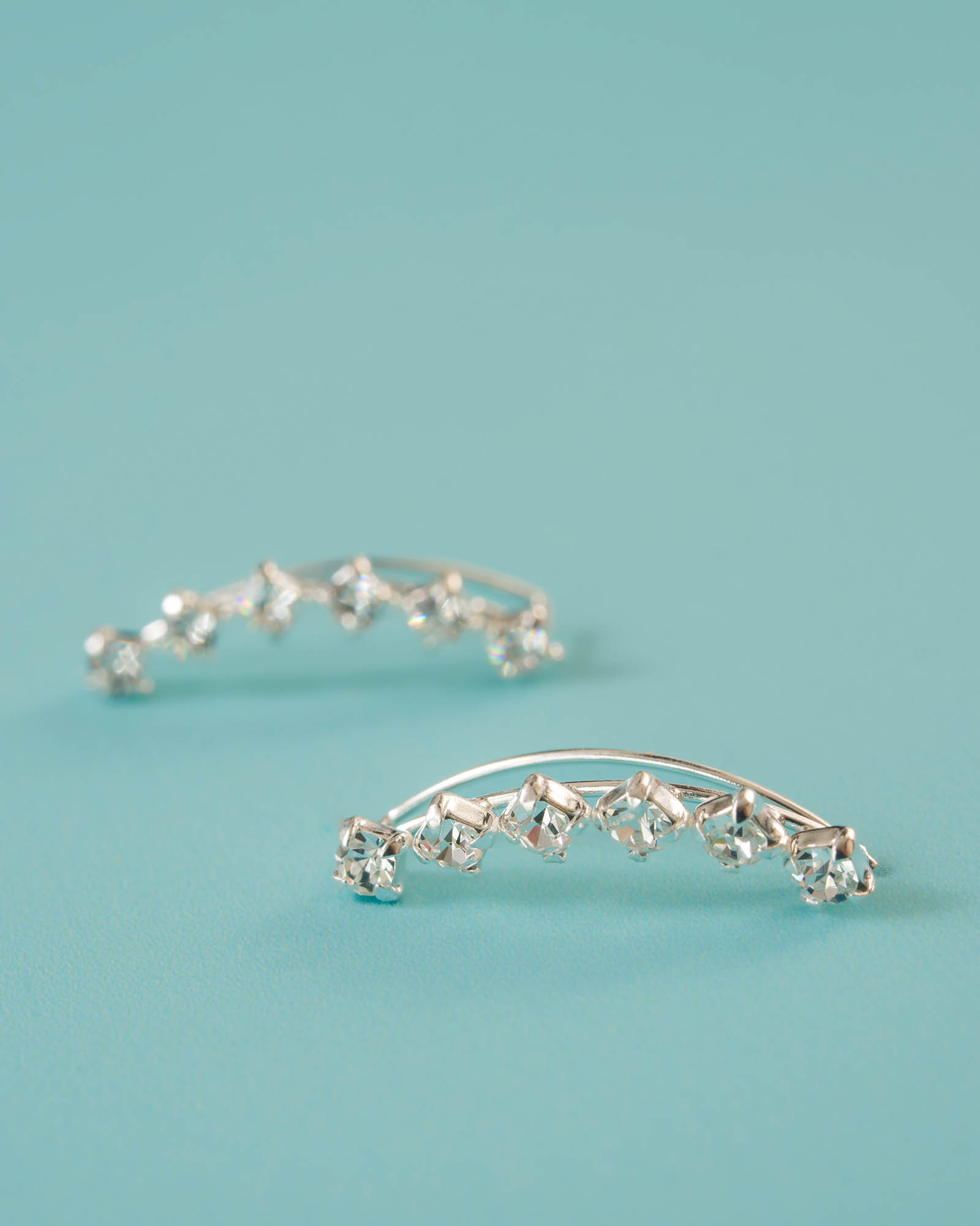 Pendiente trepador fino en plata de ley con seis circonitas que simulan diamantes. Elegancia minimalista con un brillo sutil que realza tus looks.
