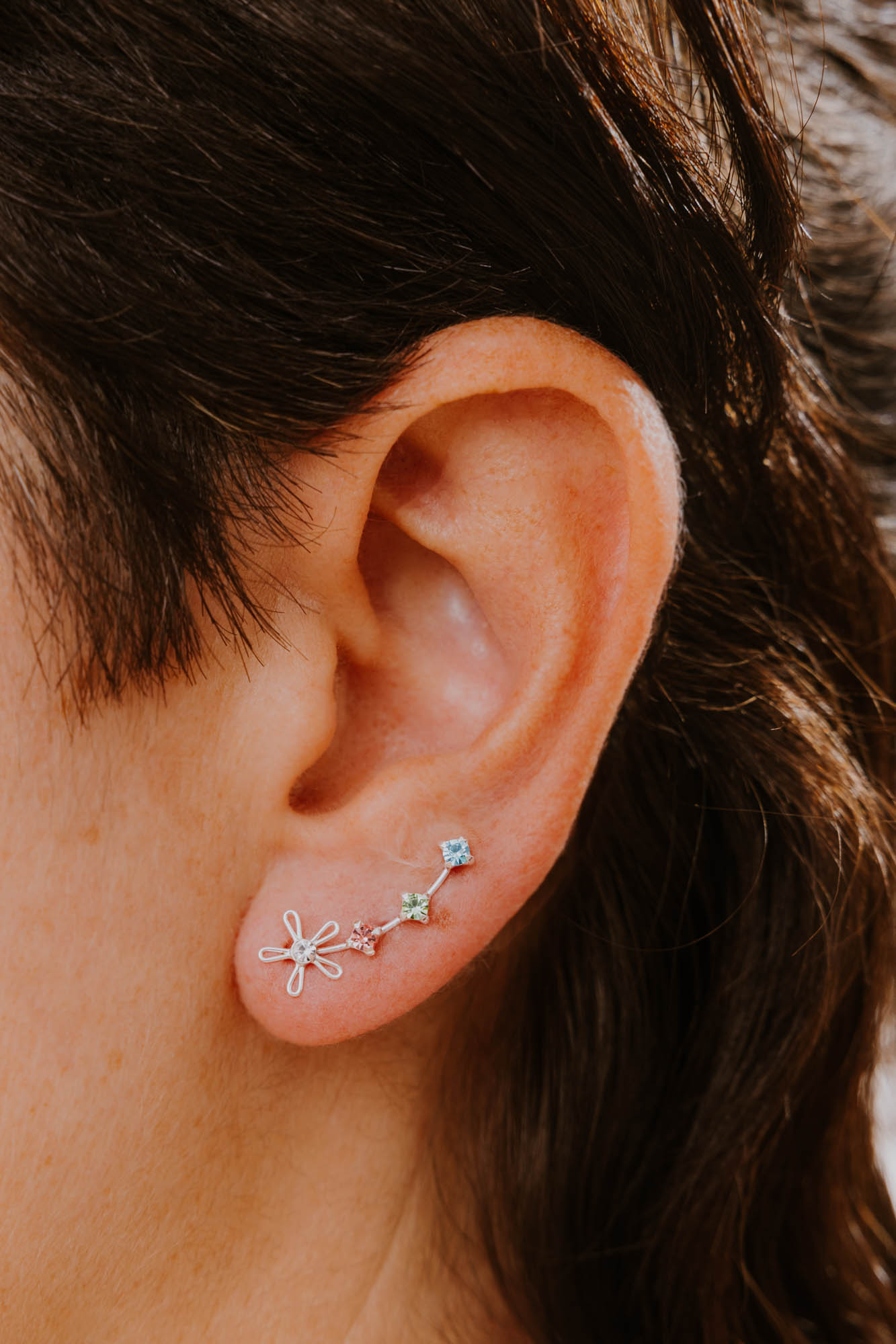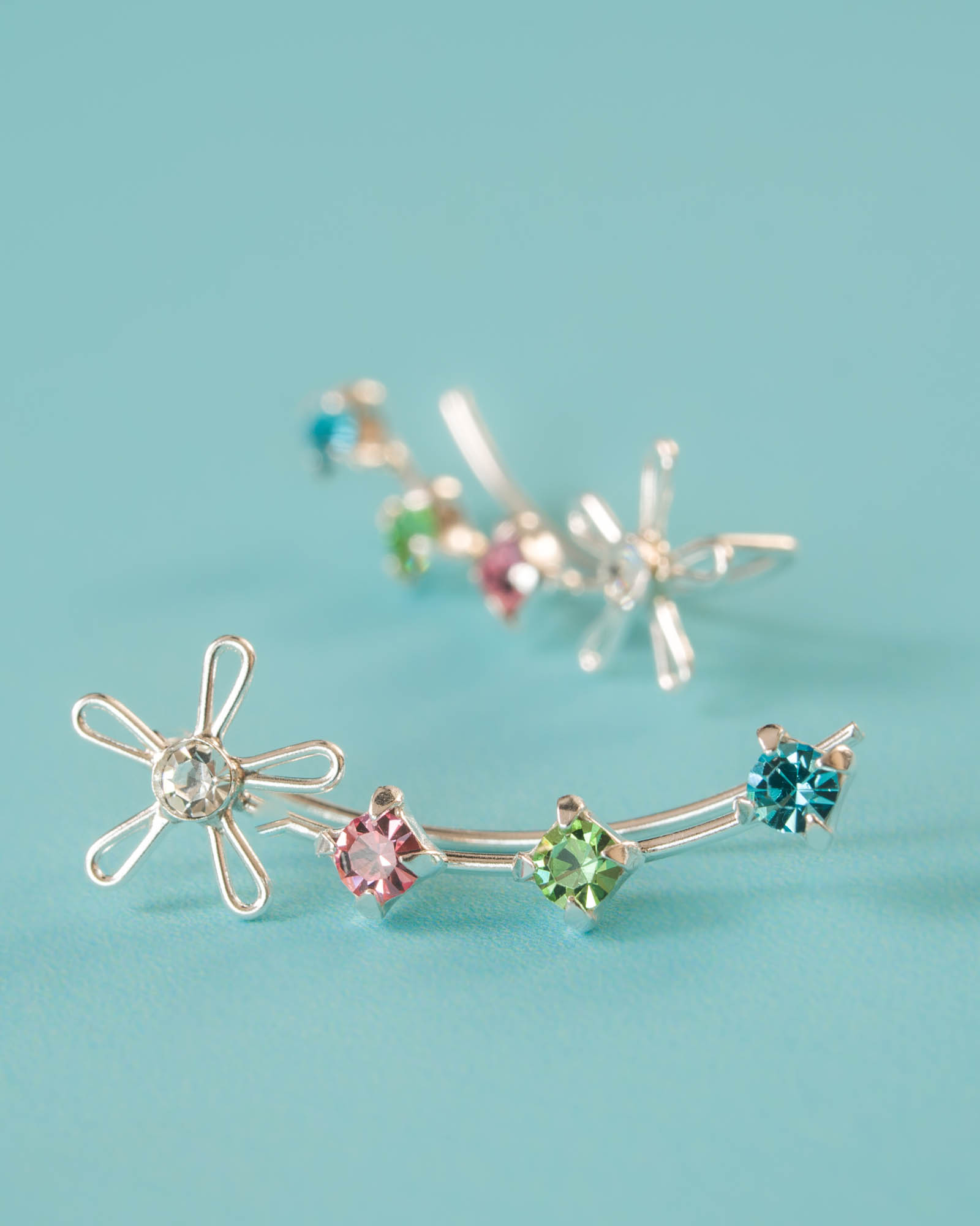 Pendiente trepador en plata de ley con flor central y tres circonitas de colores. Sutil, brillante y delicado, perfecto para darle un toque de color a tus outfits.