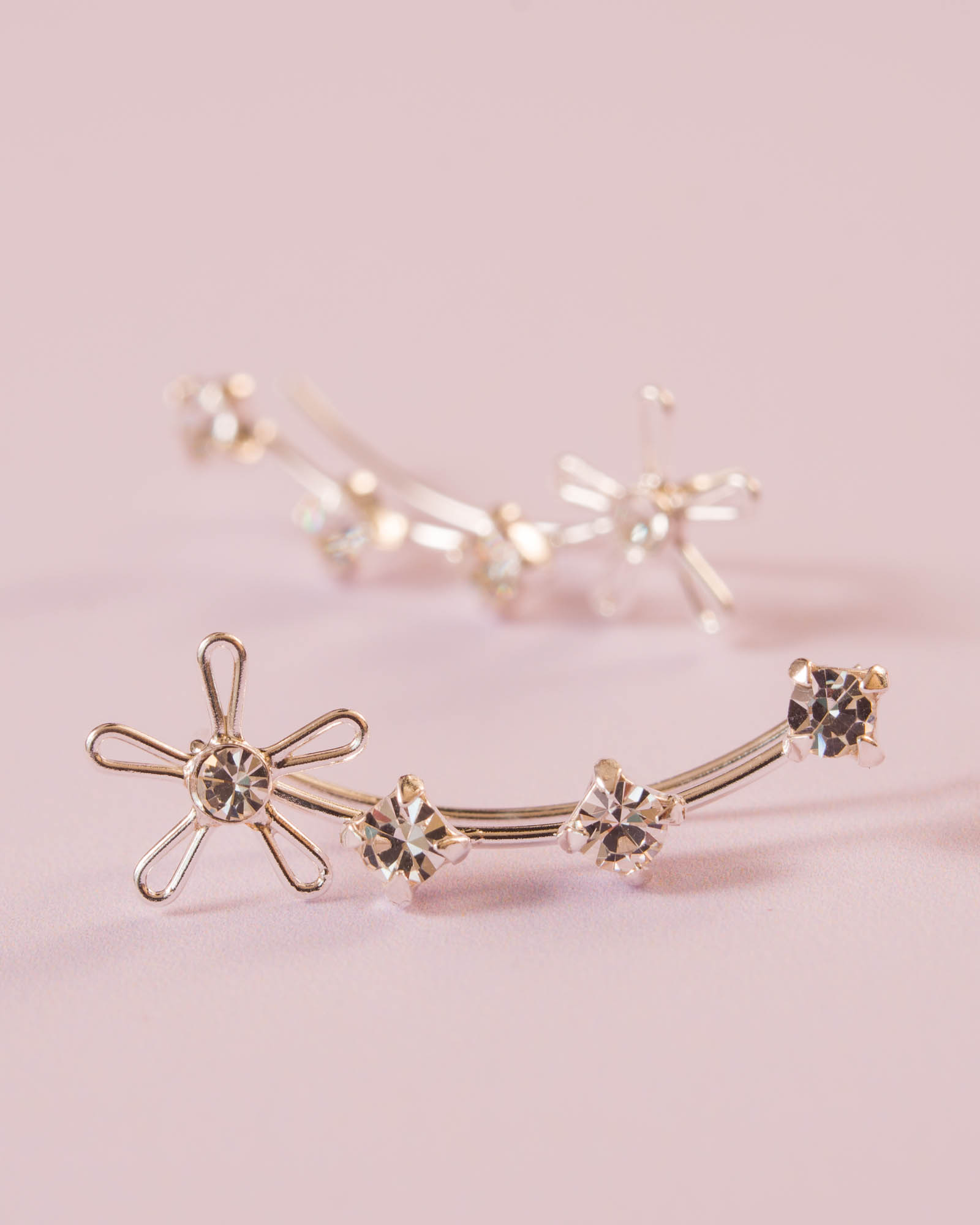 Pendiente trepador de plata de ley con delicada flor y circonitas brillantes blancas. Elegancia sutil que realza tú estilo con un toque floral y moderno.